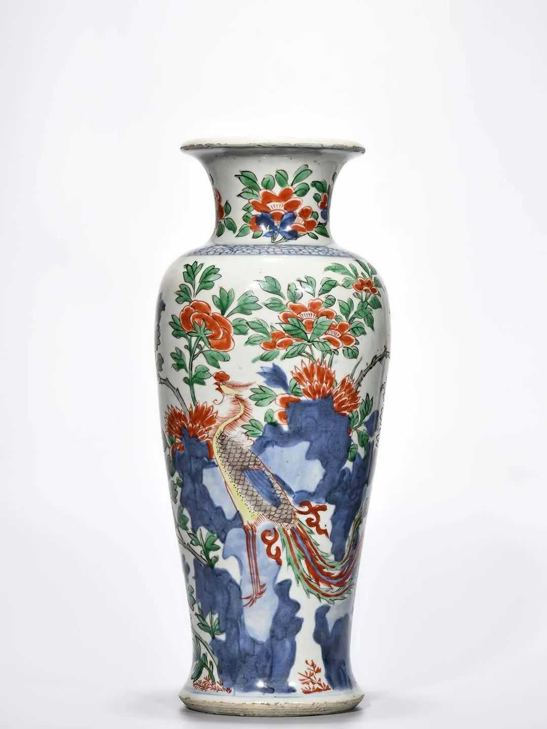 清顺治时期瓷器较多保留晚明多古拙风格,加绘青花的色彩浓重的五彩器,俗称“大明彩”。本品侈口,颈部较短,丰肩,肩下弧线内收,至胫部以下微微外撇,浅圈足,瓶体修长,线条流畅,尤如亭亭玉立的少女。颈部绘花卉图,腹部绘主题纹饰绘洞石凤凰图案,栩栩如生,突显工匠技法之娴熟。