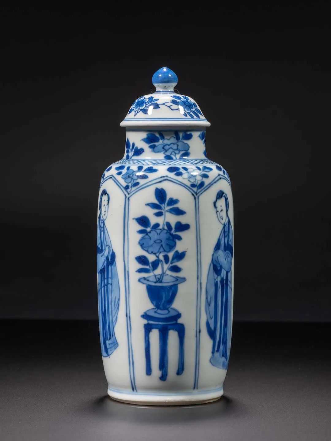 瓶身作二对开光,两位仕女对笑嫣然,中绘盆景花卉。或为二乔,脸庞饱满,眉似弯月,唇如朱点,端庄稳重。本品为康熙青花精品,青花发色明快,釉如玉,胎质坚,底青花书“玉”字款。与拍品相似一例可见英国VA博物馆,编号为,同为玉字款。