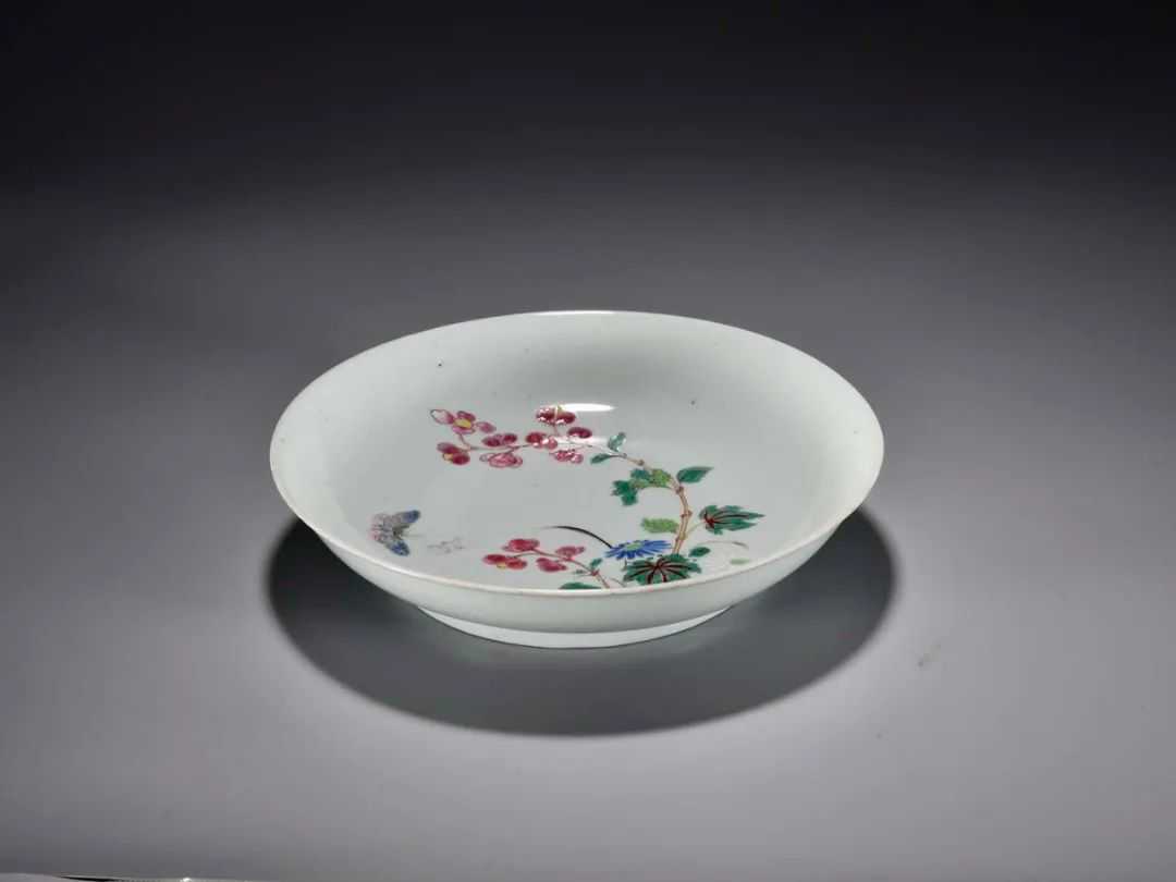 拍品胎薄体轻,盘心以没骨法绘秋海棠、雏菊高低错落,摇曳生姿,引彩蝶翩翩而来,画面生动,风格清新雅致,敷彩鲜艳,玻璃质感强烈,近似料彩的效果,为雍正时期粉彩瓷之精品。