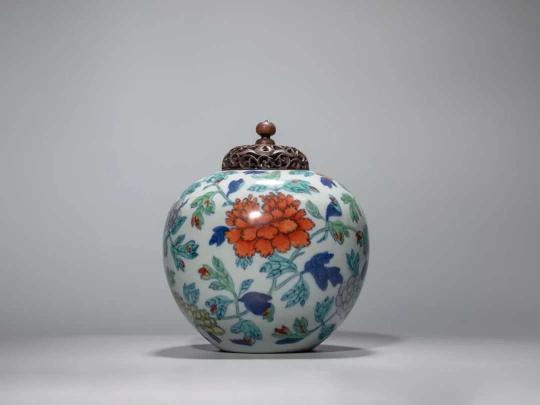 斗彩极盛于成化,具体做法为先于胎体上以青花绘制纹饰轮廓,罩以透明釉高温烧造,再于釉上轮廓内填以各种彩料,入窑低温烘烤而成。而本品在斗彩的基础上又多了一道工序,在叶上再填矾红彩烧制。拍品器形圆鼓饱满,似大号的苹果尊,整身绘大朵牡丹花卉,恣意富丽。