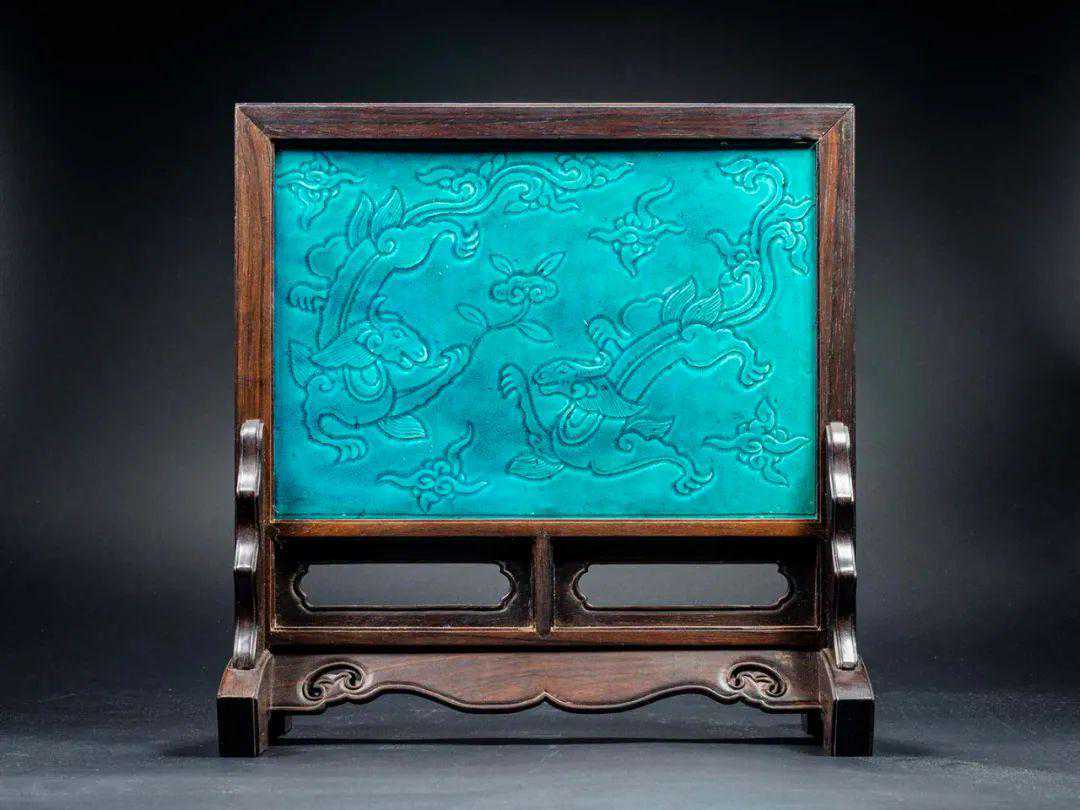 清康熙孔雀绿釉雕香草龙纹桌屏
