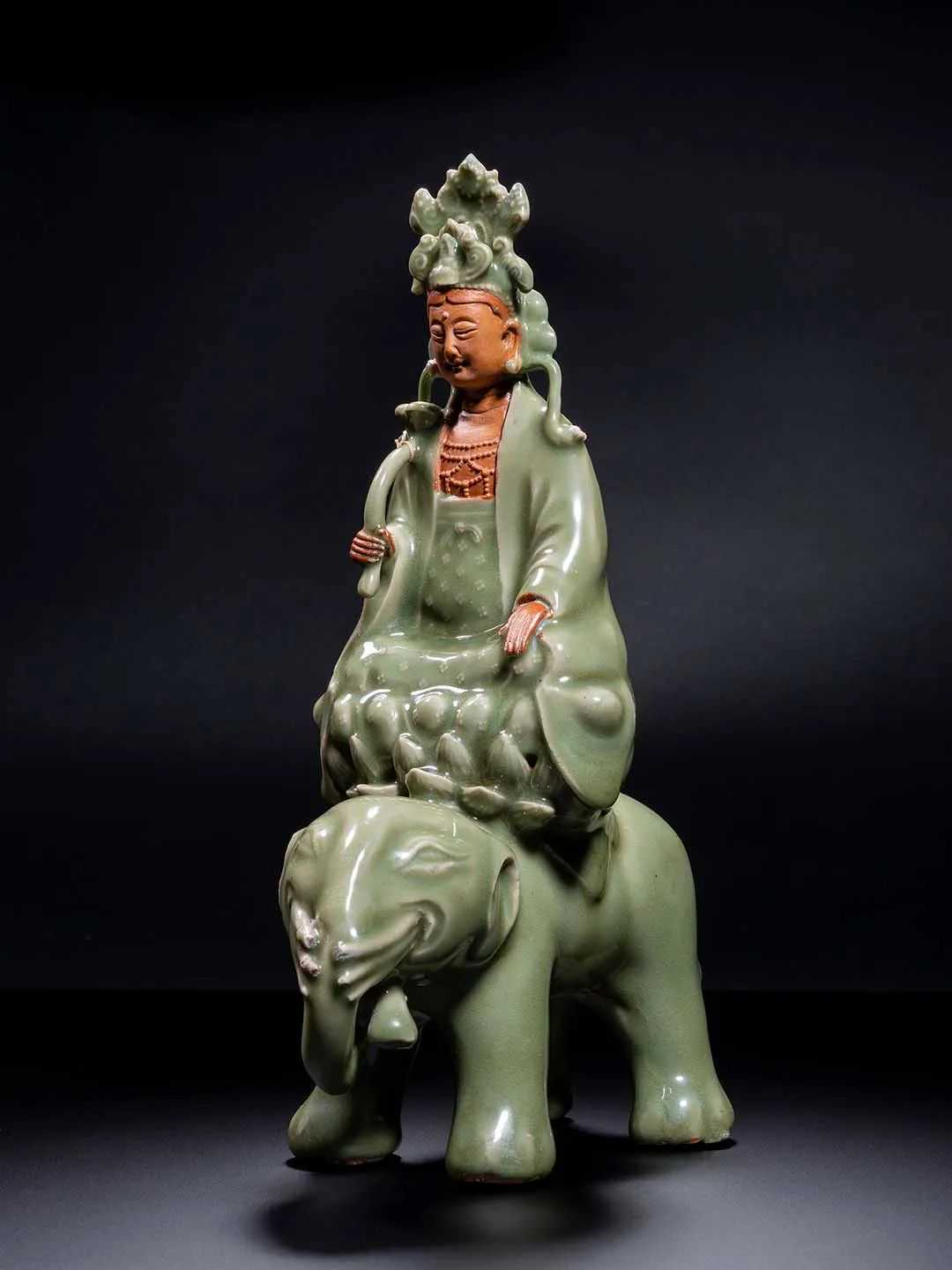 本品为典型的元代龙泉窑座像,通体施龙泉梅子青釉,釉料肥腴失透、温润如玉。拍品普贤菩萨坐于莲座之上,下托六牙白象,面容饱满,神态端庄,给人以宁静祥和之感。唇角深凹,微微上翘,浮现出一丝若有若无的笑意,妙丽庄严,头顶花冠,胸佩璎珞,披帛着长裙,衣纹线条流畅。