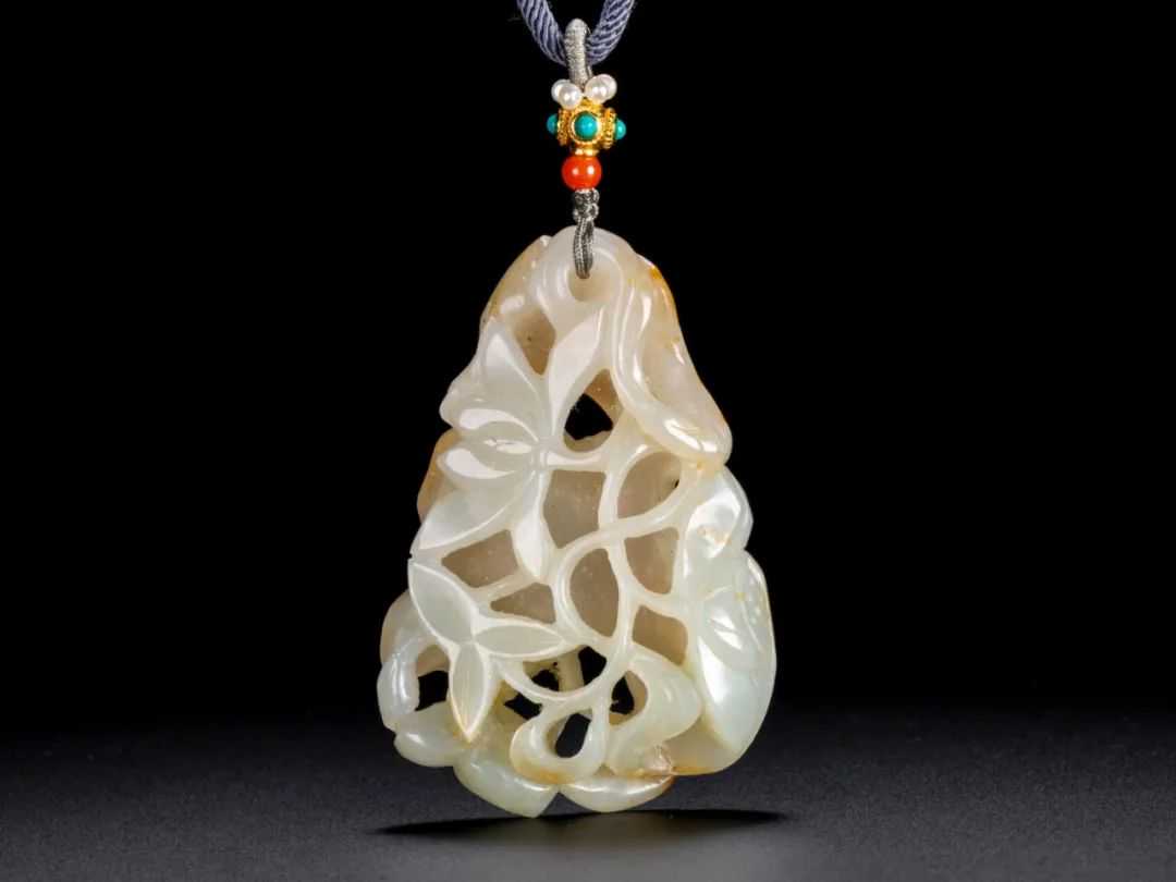 此器整体镂雕荷花纹,工艺精巧,荷叶、花蕊、枝脉交错相连,形成中空的香囊式坠。玉坠顶端有穿孔,以便穿系佩戴。选材讲究,玉质白润细腻,白玉留皮,既保留了原石的完整度,又增添了视觉上的美观效果。以荷花为雕刻题材,有“出淤泥而不染,濯清涟而不妖”之寓意。
