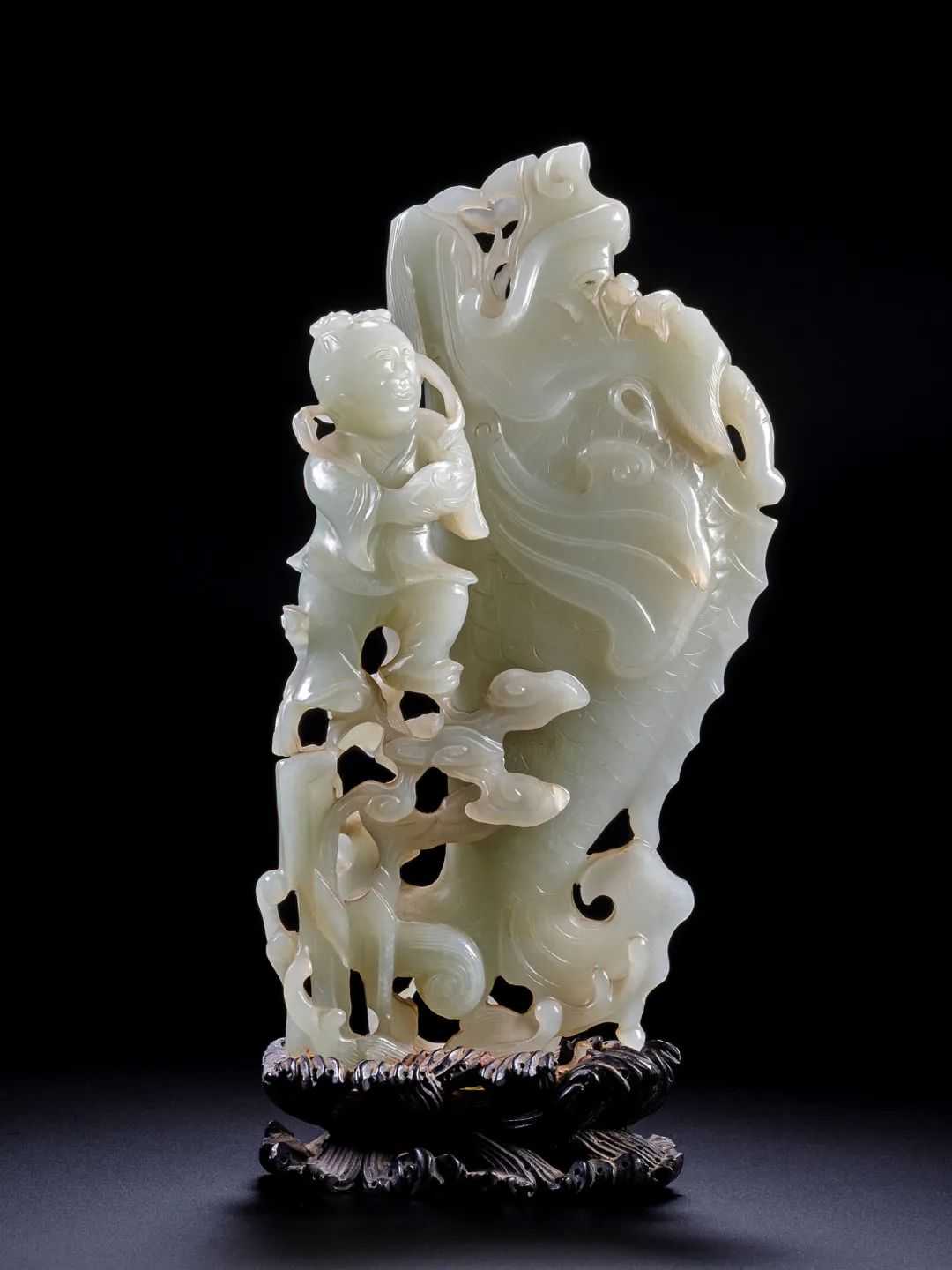 此器通体白玉质地,选材上乘。童子立于一侧,线条雕刻清晰,另一侧则整体雕琢一只正在化龙的大鲤鱼,翻滚在波涛之间。鱼之头部已经幻化为龙形,独角后仰,阔口露出獠牙,颈部鬃毛飘逸,显得十分威严。“鱼化龙”是传统的吉祥题材,传说鲤鱼长到一定程度就会跃龙门化而为龙,古人常常借此比喻读书人参加科举,一举得中之喜。整件器物工料俱佳,寓意美好,配有底座,实为佳品。