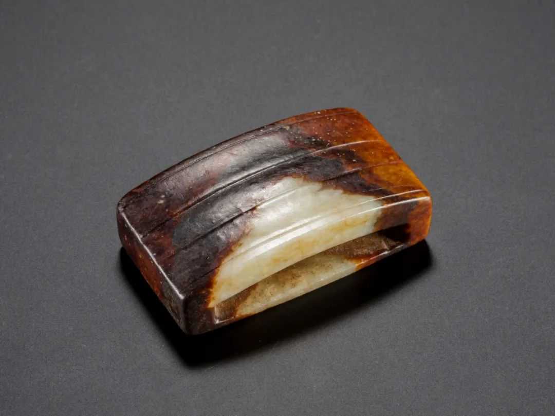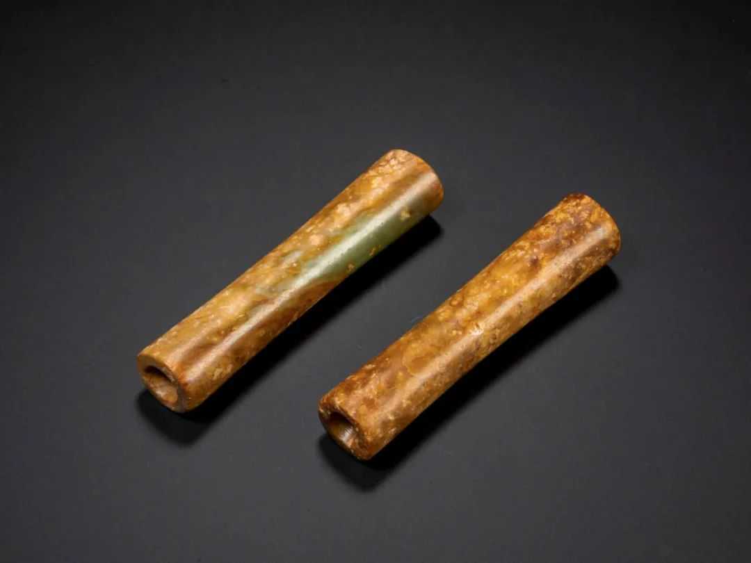 此对玉勒受沁呈红褐色,中部收细,两端撇口且对钻一大孔用以组玉佩穿系。玉勒在古人眼中,是驱邪的祥瑞之物,用于佩戴庇佑自身平安顺遂。