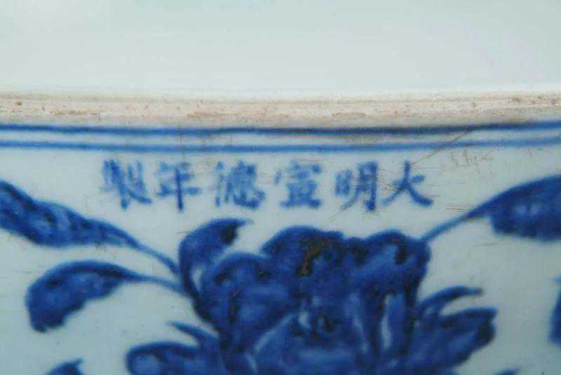 明宣德款青花碗,造型浑厚古朴,釉质肥厚滋润。口沿下绘二道弦纹,圈足外饰一周花朵,脚处绘仰莲辨纹,腹外壁绘盛开的串枝牡丹。口沿外则书“大明宣德年制”六字楷书横款。青花纹饰均用进口的“苏泥勃青”(亦称苏麻离青)钴料绘成,色泽深重深沉,绚丽鲜艳。宣德官瓷青花器,国内外存世极少,堪称稀世珍品。