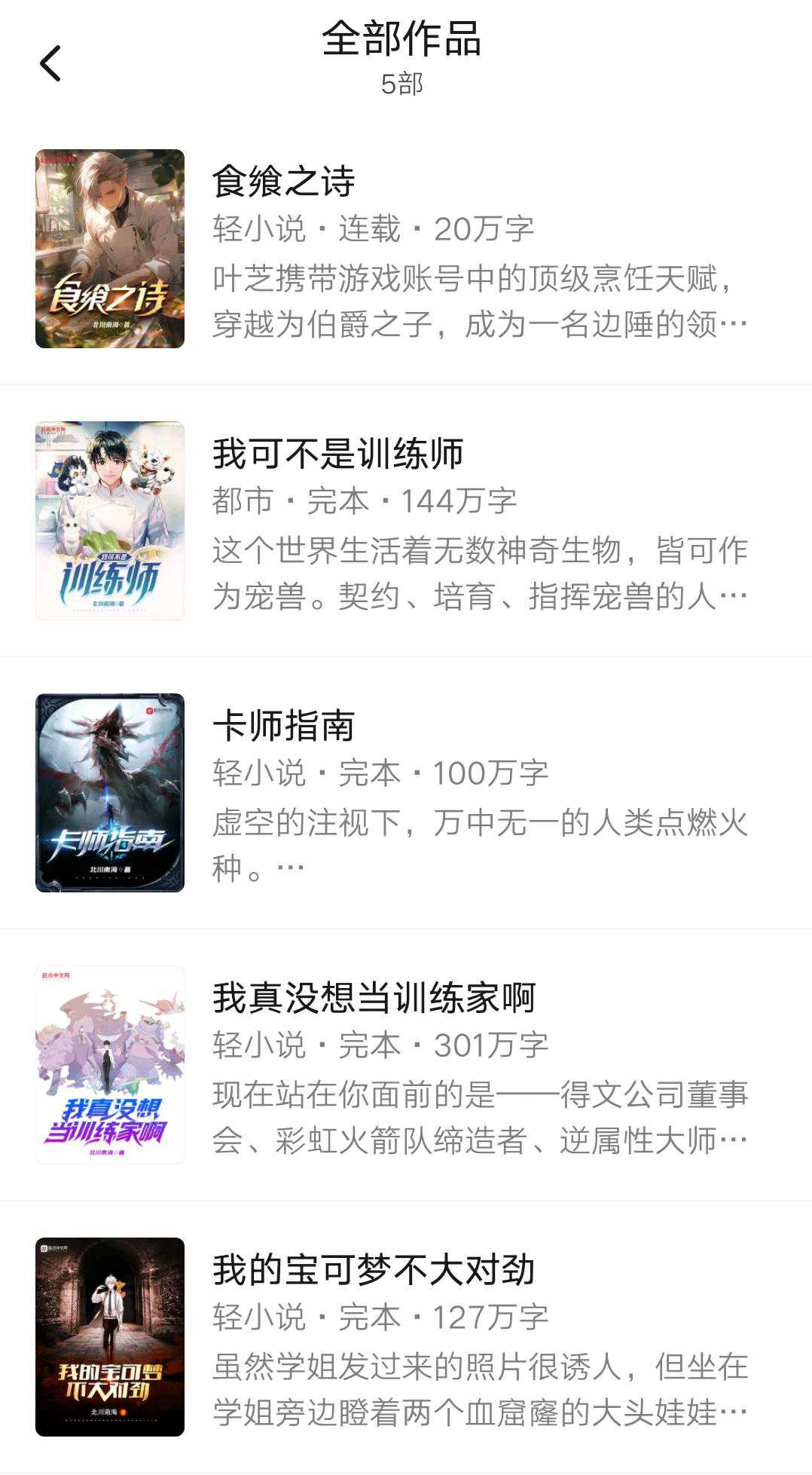 目前这也是这个账号下北川南海的第三本原创题材小说。前两本的《卡师指南》《我可不是训练师》写的都不长,只是百万字以上,完结时候的成绩也都在七千均订上下,还是不差的。