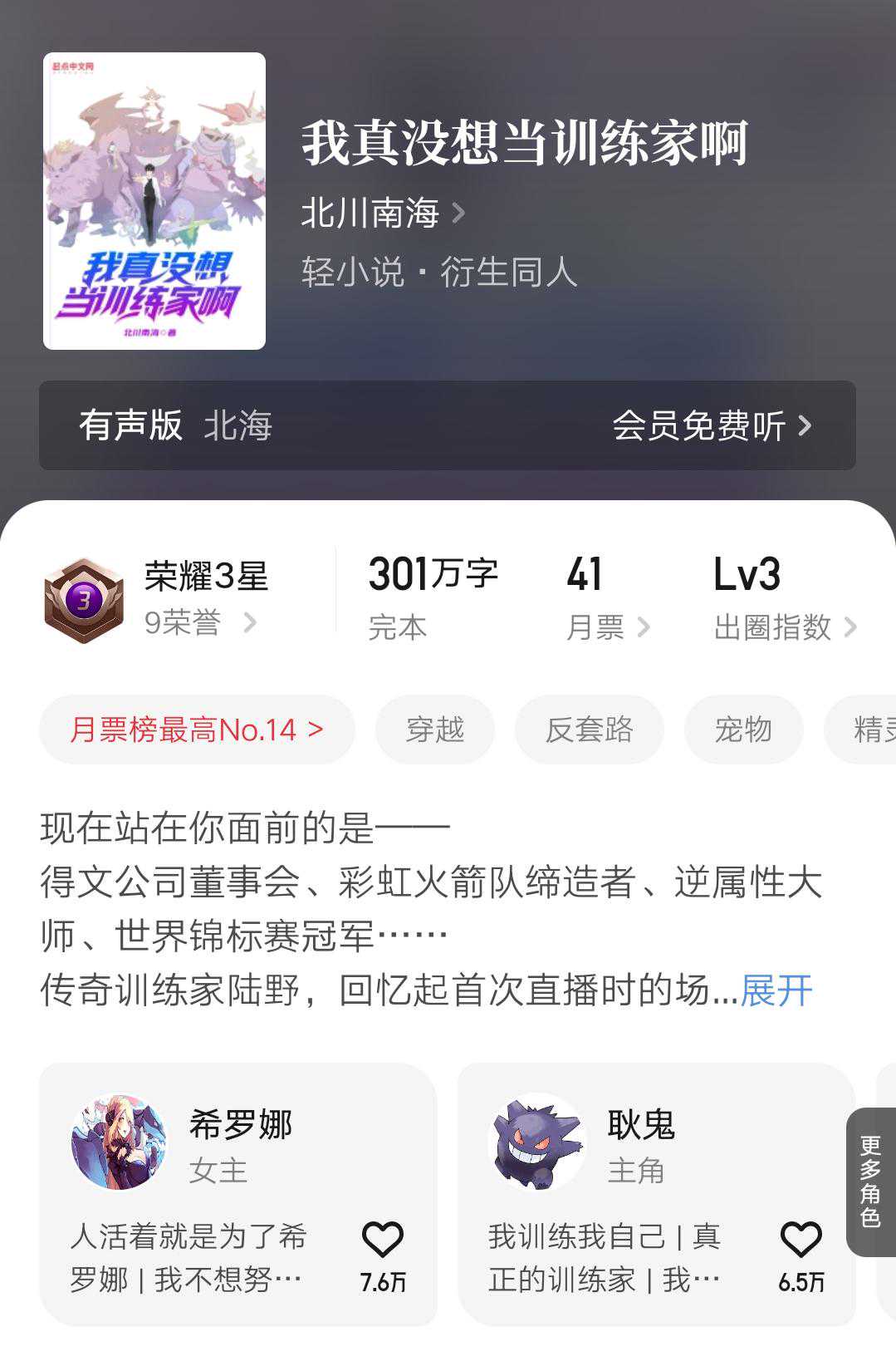 他目前的巅峰还是2021年那会写宝可梦同人《我真没想当训练家啊》的时候,是轻泉流响的《精灵掌门人》之后起点第二本拿到万订成绩的宝可梦同人,为这个题材的热度添砖加瓦了。