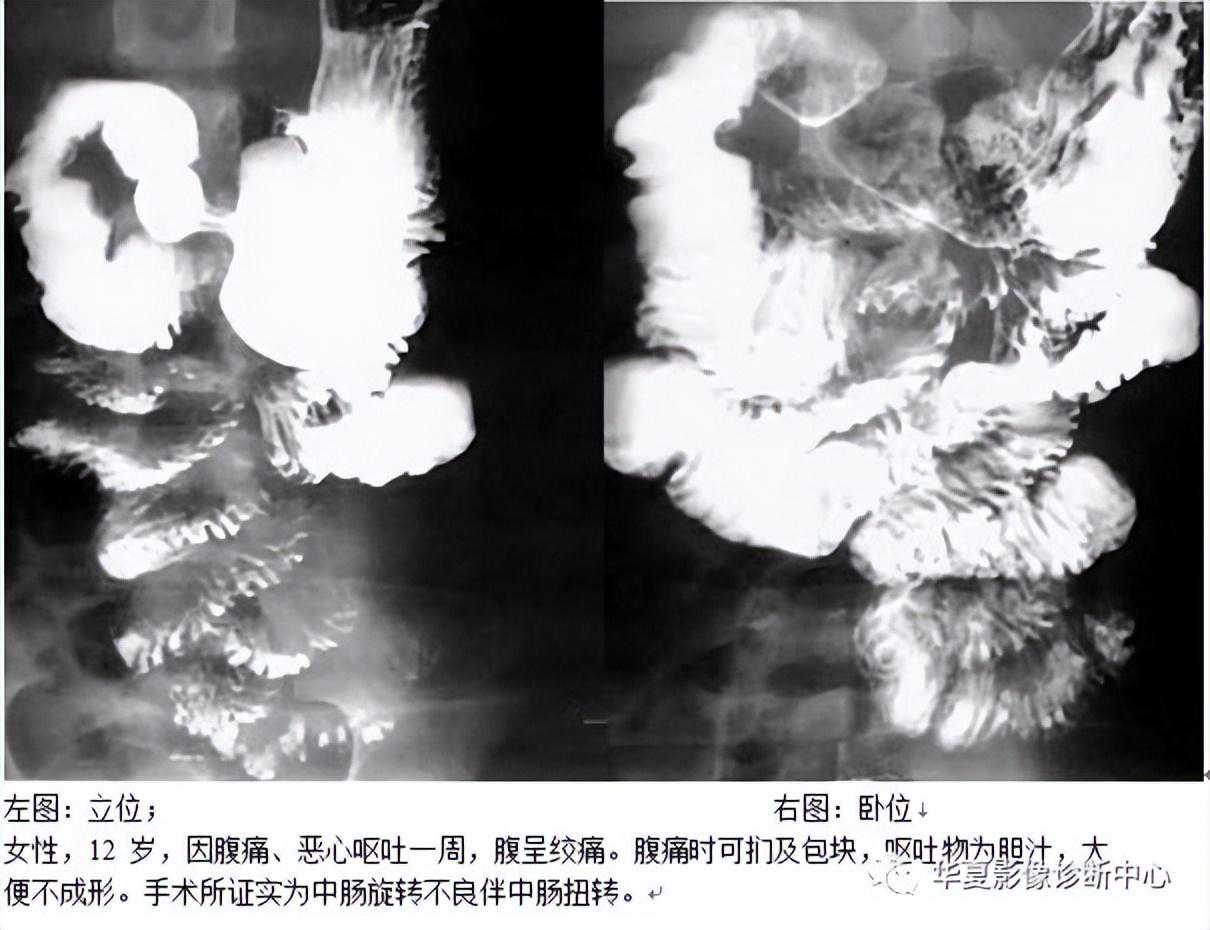 肠旋转不良时,前后位X线检查可以显示十二指肠空肠曲下降而位于脊柱右侧或中线区,侧位X线检查则位于脊柱前方。如果合并中肠扭转,则可能会显示拔塞钻征;如果同时存在腹膜索带则十二指肠近段将扩张。随着十二指肠近段梗阻程度进一步加重,拔塞钻征将会消失。上消化道造影检杳的特征性改变表现在十二指肠与上部空肠走行方向和梗阻特点上,此特征性改变是手术前诊断和鉴别诊断的主要依据。