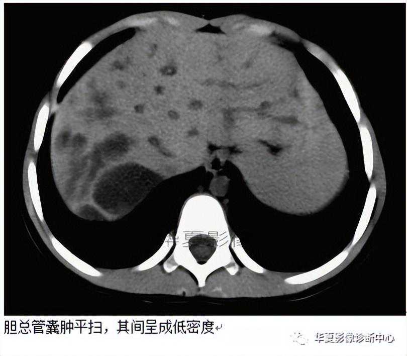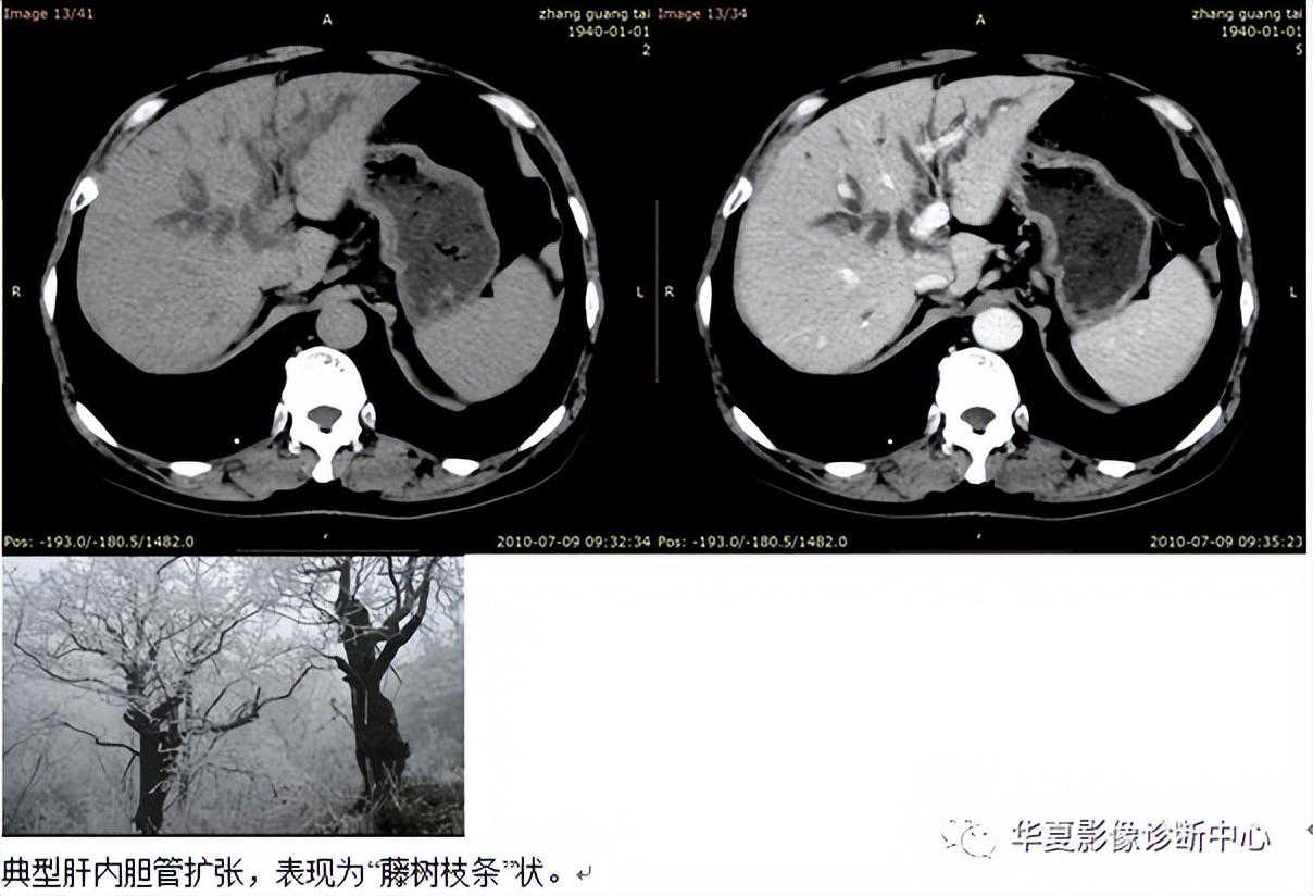 1)肝胆管扩张,肝内胆管扩张常呈不对称性或局限性分布,以左叶为明显,扩张的肝内胆管呈聚集状,同时胆管扩张常表现在肝内胆管一、二级分支,而周围胆管炎性纤维丧失扩张能力,表现为中央箭头征。肝外胆管扩张亦很常见,且程度不一。增强扫描肝内胆管壁的强化密度高于肝实质常提示急性发作期,胆管壁可显示弥漫性偏心性增厚。