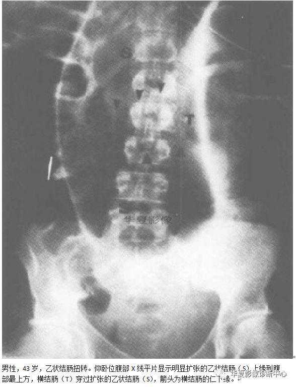 扩张冗余的横结肠会有类似乙状结肠扭转的征象,但它的特征是腹部结肠向头部延伸形成U形,而并非起源于盆腔。盲肠扭转很少误诊为乙状结肠扭转,尽管两者都有结肠形成的朝向.上腹部的扩张肠撵,但盲肠扭转仅只有1个气-液平面,而乙状结肠扭转可以有2个气-液平面。