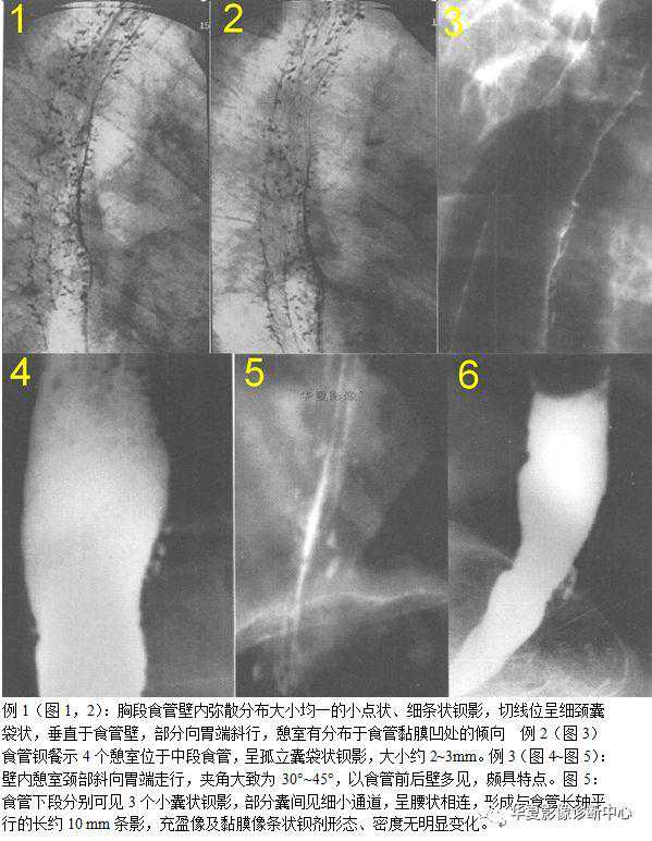 【影像表现】食管钡剂造影发现囊袋状憩室自腔内向外突出,憩室一般表现为食管壁内泪滴状或细颈瓶状钡剂积聚,直径0.5~2cm。