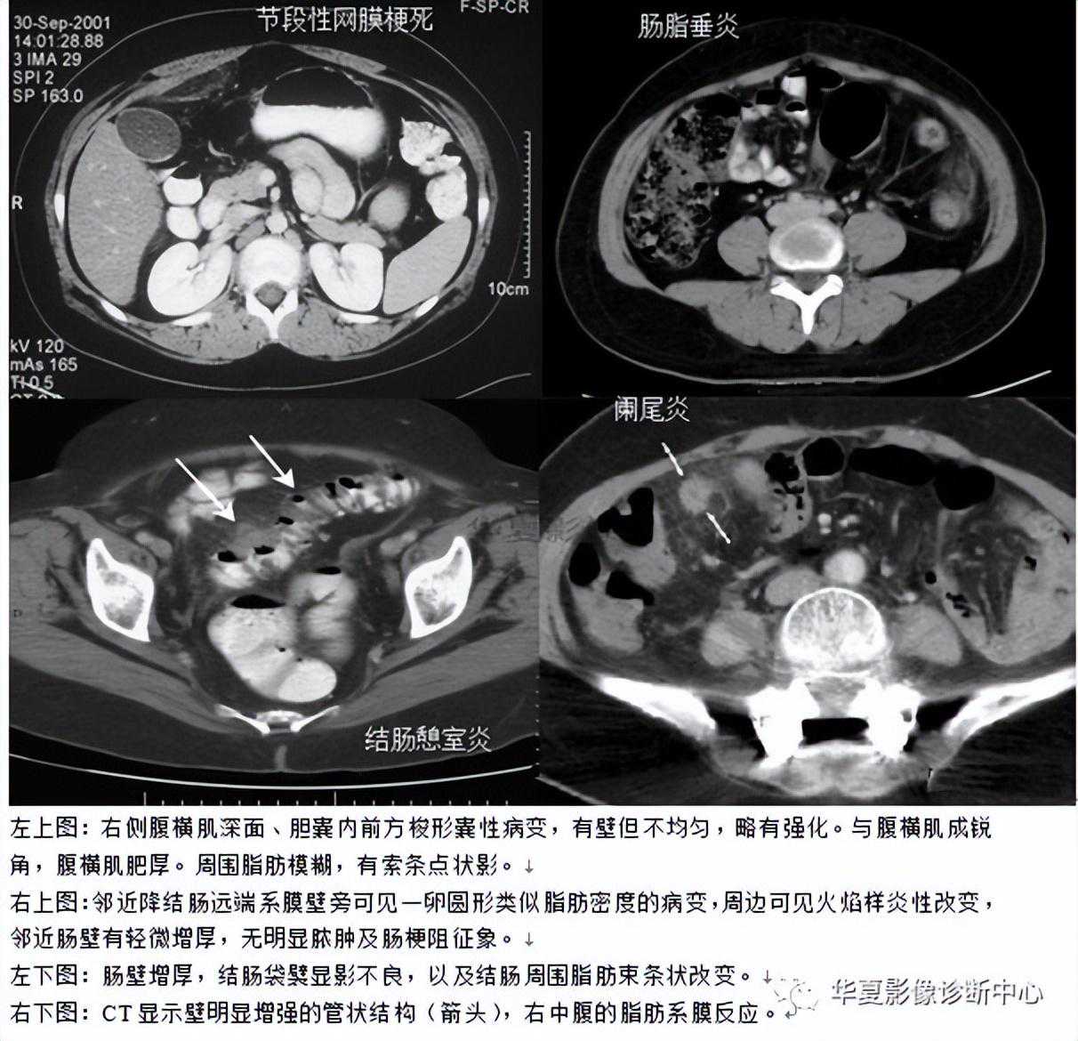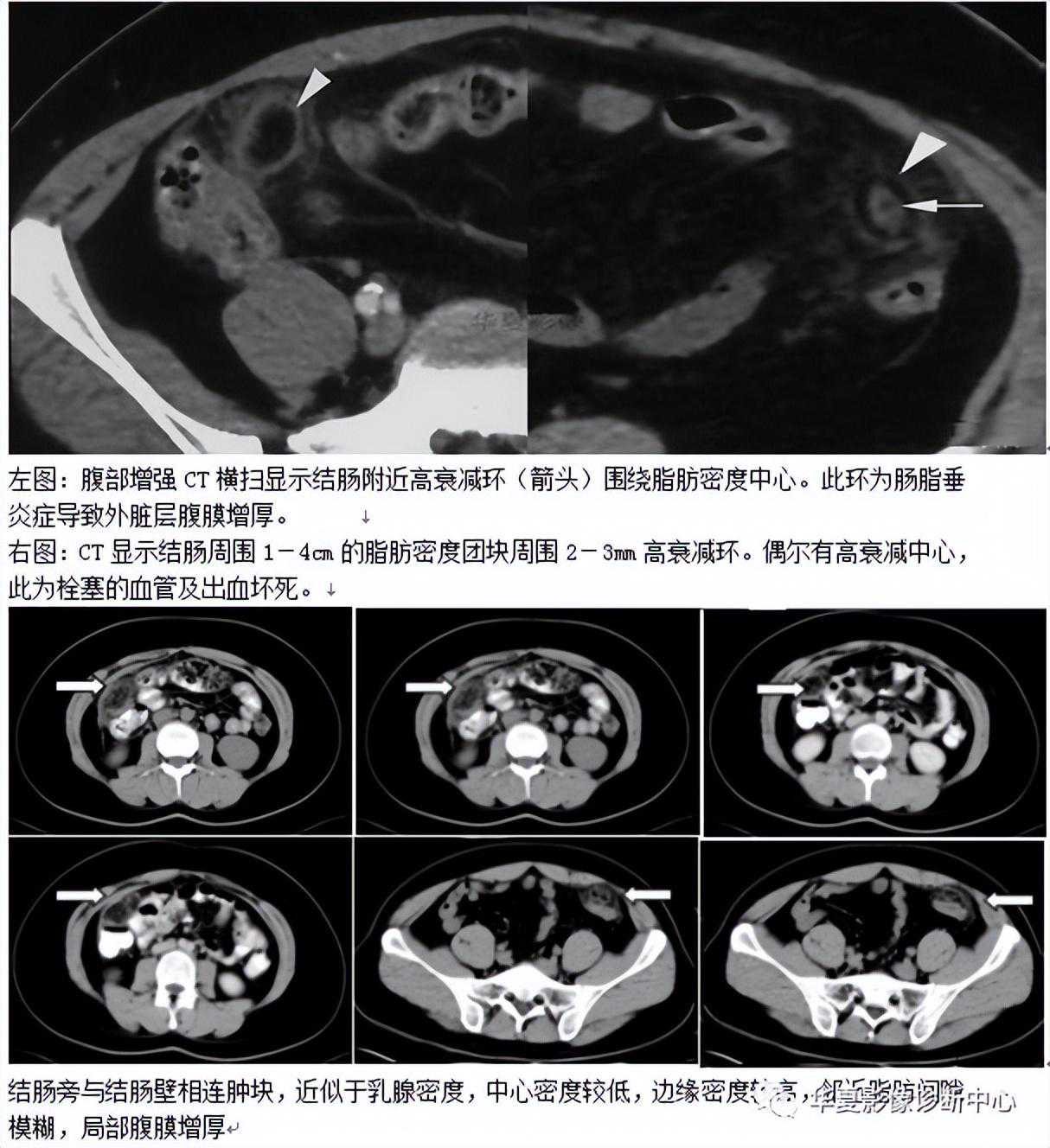 阑尾粪石可能增强阑尾穿孔的机会,当发现阑尾钙化或阑尾粪石,同时合并阑尾周围炎时,是诊断阑尾炎的可靠征象。阑尾粪石也可出现在阑尾穿孔形成的脓肿或蜂窝织炎内。阑尾周围炎表现为阑尾周围脂肪组织中条索状、斑片状密度增高影(称脂肪条带征)、结肠后筋膜增厚、阑尾周围液体渗出,局部形成脓肿。阑尾周围炎只是阑尾炎的一种主要间接征象,不能单凭此诊断阑尾炎。阑尾周围炎性反应或右下腹脓肿提示阑尾炎,但Crohn病、盲肠炎、憩室炎、肿瘤穿孔和盆腔炎等亦可有相似的表现,应与之鉴别。通过对阑尾强化程度和阑尾周围炎症改变对急性阑尾炎的严重程度作出初步评估,指导临床治疗。正确选择治疗方法基于对急性阑尾炎的正确诊断及对其严重程度的分级,正确诊断急性阑尾炎并区分卡他性阑尾炎、蜂窝织阑尾炎及坏疽性阑尾炎非常重要。总之,阑尾直径增粗>6mm,阑尾壁高度强化伴有或不伴有阑尾周围炎症改变或阑尾中、低度强化,可作为诊断阑尾炎的依据;阑尾周围是否出现炎症可作为区分卡他性阑尾炎与其他类型阑尾炎的依据。