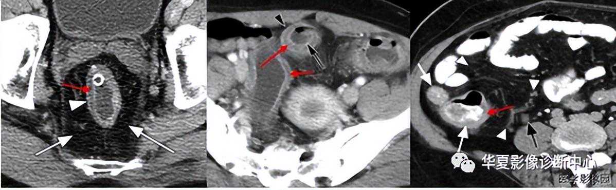 在急性期,受累的肠壁呈分层表现,CT上呈靶样或双晕状表现,这可能是由于黏膜下水肿或肠壁脂肪浸润所致.肠壁增厚并不是克罗恩病特有的表现,事实上,非活动性溃疡性结肠炎的患者占60%以上,而仅有8%患者有克罗恩病。