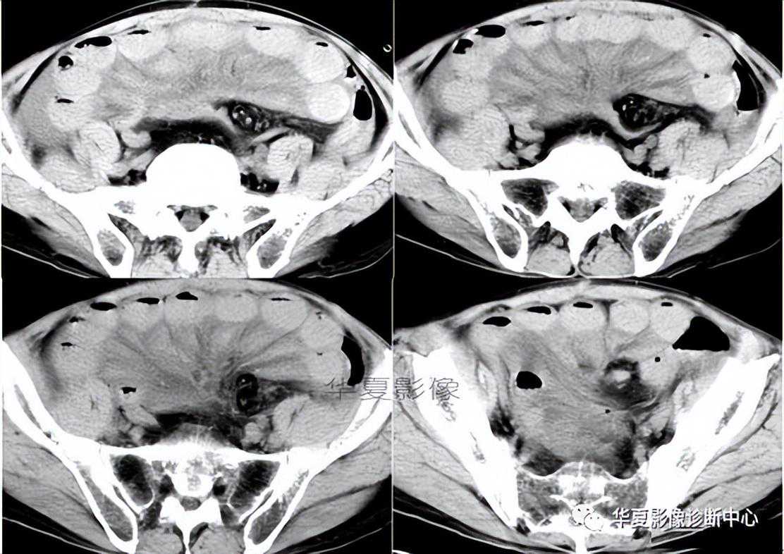 CT上漩涡征的出现能够提示肠扭转的发生,但是如果扫描平面与扭转轴不相垂直的话,漩涡征可能显示得不明显,其他有关小肠扭转的CT征象也有文献描述,比如扩张肠襻的放射状分布或U形结构,或者在扭转处肠管的纵切面形成的三角状或逐渐变细,上述这些CT征象在小肠闭襻性肠梗阻也可以观察到,依照闭塞段的长度、肠管扩张的程度、闭襻的位置方向以及CT扫描时切面的相对位置不同,显示也有所差异。