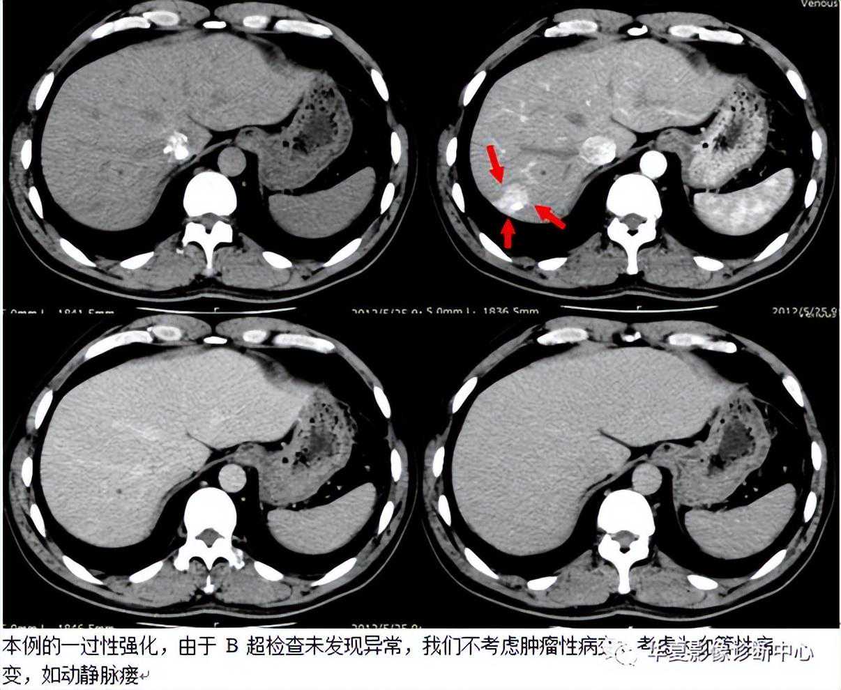 CT平扫大多数表现为等密度,少数表现为楔形或三角形低密度区,可能与门静脉分支堵塞后,富含营养的门静脉血流灌注减少,相应肝段出现营养不良性水肿,继发局部的脂肪变性有关。增强扫描时多表现为动脉期一过性楔形、三角形或类圆形异常强化区,少数为强化减低区,门静脉期恢复等密度。这种变化可累及肝段、亚段及肝叶,可多发,也可单发,多位于肝周围区域;MR表现类似于CT,平扫大多呈等T1、等T2信号,少数可表现为长T1、长T2,但MR在显示门静脉堵塞后继发改变较CT敏感。动态增强扫描时强化及分布特征类似于CT。肝动脉造影时见楔形、三角形肝段染色,可位于肝脏相关病灶周围或邻近肝段,有门静脉堵塞者间接门静脉造影可见相应区域染色缺失或减弱,有肝静脉堵塞及异位血管变异者会有相应造影表现;HPD时,超声可能表现为楔形低回声区,超声增强是否通过切面实时观察到HPD,尚无文献报道。但是本例超生检查未发现异常。
