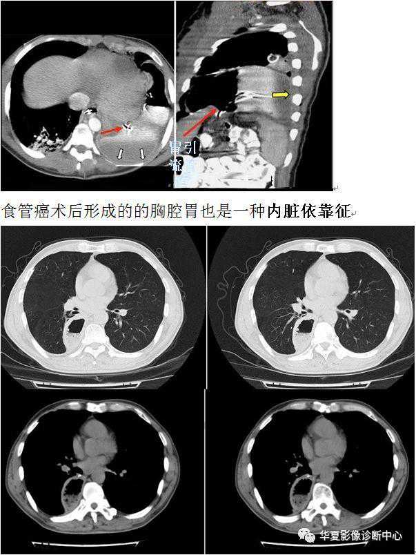 右侧横隔破裂时,肝脏上1/3往往与右后肋相贴近,左侧破裂胃、肠甚至脾、肾可病入胸腔,胃、肠等往往与左后肋相贴,Birgin等131将此征象定义为“内脏依靠征”。病人CT检查时取仰卧位,如果横隔破裂,疝出的内脏(肠腔或肝脏等)不再受后方横隔支撑而下靠到后肋。基于此机制,非外伤性如先天性、炎性隔疝及食管癌术后的胸腔胃等也可出现此征象。有时右侧易漏诊,因肝脏疝出早期、程度轻时可暂时堵住裂孔不易发现,而且“内脏依靠征”有时也带有一定的主观性,有时CT诊断也较困难,带有一定的局限性。