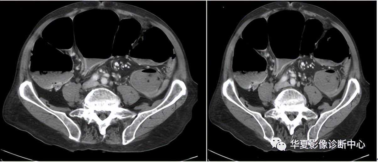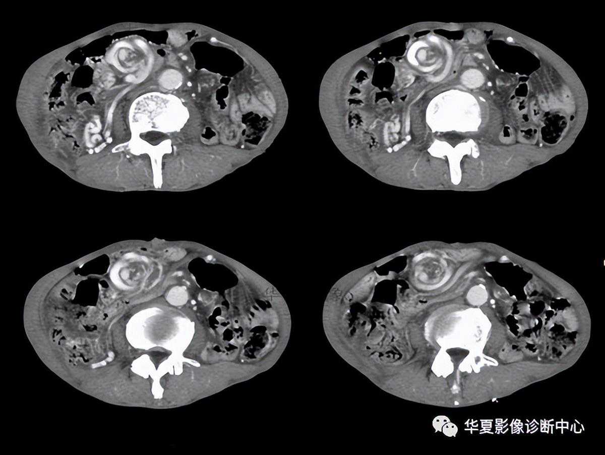 腹部CT平扫,肠系膜血管增厚并延长聚集在一起,充满液体的扩张肠襻呈放射状排列的肠系膜血管周围。当小肠扭转时,肠系膜根部相应发生扭转,肠系膜短变紧并沿着旋转轴呈漏斗形。这使得与肠系膜相连的得肠管呈同心园围绕在肠系膜血管周围,扭曲增厚的肠系膜血管占据中心,肠管扩张,肠腔内充满液体。分布在肠系膜上的血管由肠壁向扭转的肠系膜根部放射状排列,形成软组织密度的皱襞,形似车轮的辐条与中心的车轴相连,称作车轮辐条征。当所扫描的横断图像与扭转肠襻的长轴呈垂直位的时候,该征象显示最清楚。小肠扭转是较少见却能威胁生命的外科急症。其伴随肠缺血的发生率高达46%,肠扭转是各种因素相互作用使肠管损害比单纯机械性肠梗阻更严重。