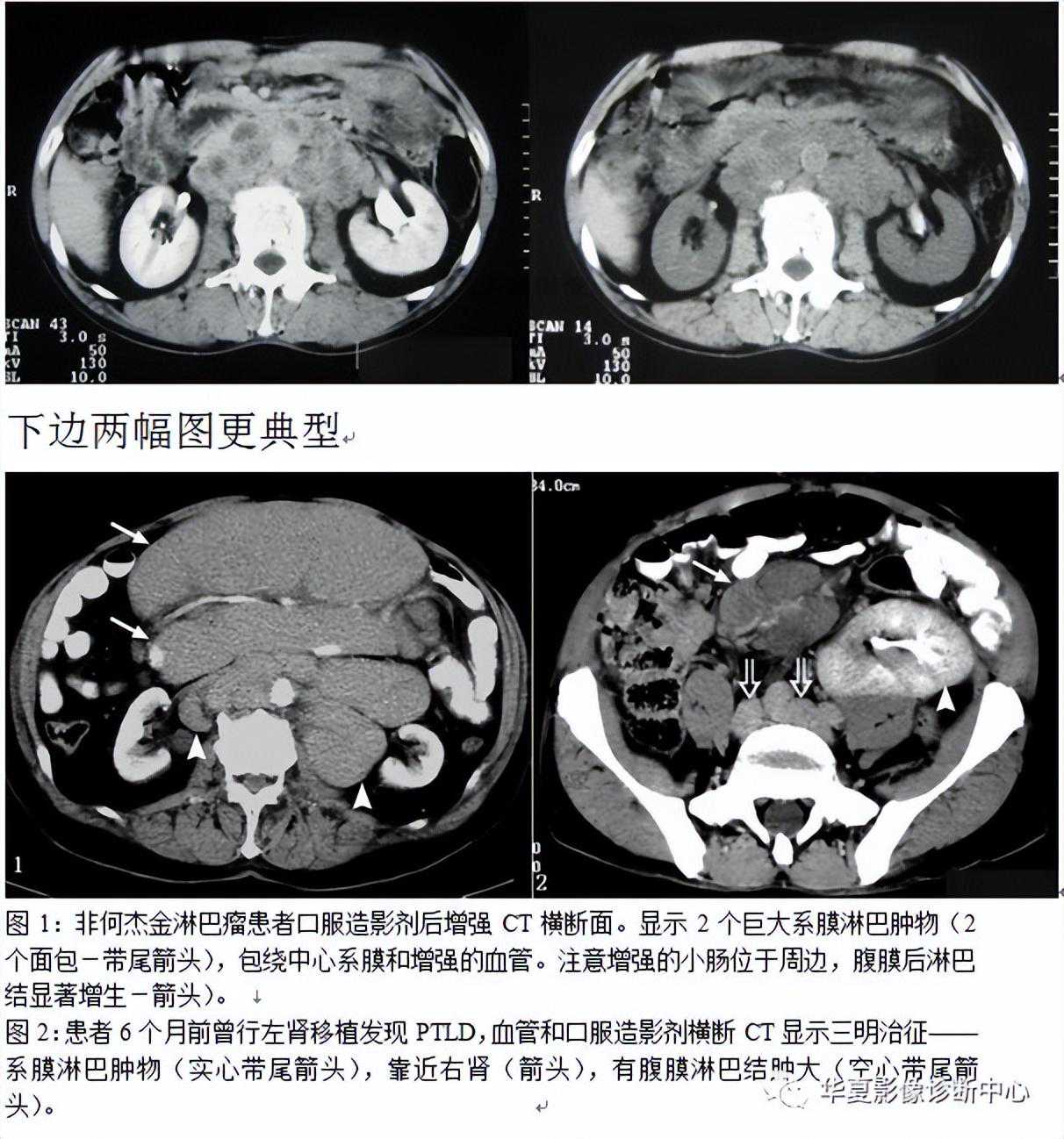 癌、肉瘤及类痛均可起源于小肠,然后向肠系膜淋巴结扩散。这些肿瘤快速侵犯肠壁而导致穿孔、出血及弥漫性病变。感染性及炎性病变通常不会引起巨大的块状淋巴结肿大,它们所引起的淋巴结肿大,通常表现为中央坏死,周边可见环形强化,此点与结核相似。因此这些肿瘤,感染及炎性病变不会产生三明治征。