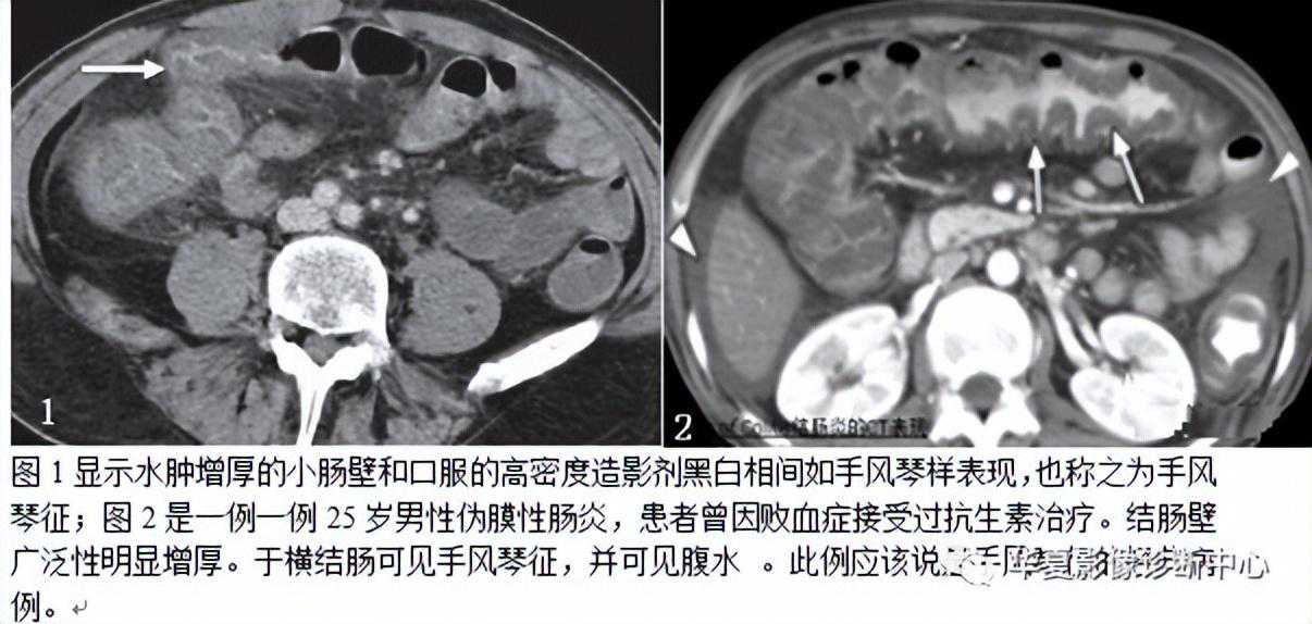 手风琴征见于口服对比剂后腹部CT扫描,主要指大肠内由低密度的软组织影与高密度的对比剂相交互而形成手风琴样的表现。手风琴征中低密度的软组织影代表了由于肠壁水肿引起显著增厚的结肠皱襞,口服对比剂后到达结肠的少量的对比剂填充于增厚的结肠皱甓之间的裂隙内,这种低密度与高密度相间的条带状表现与手风琴非常相似。根据结肠水肿的程度不同以及对比剂在结肠皱襞的裂隙间沉积量的多少而表现有所不同。该征被认为是假膜性结肠炎(PMC)的特征性CT表现。