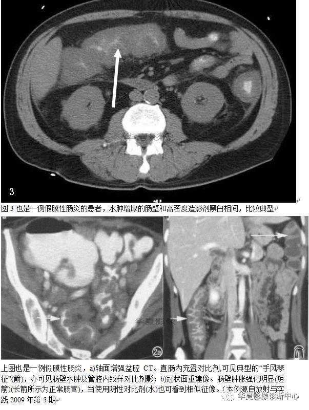 PMC的确诊依靠粪便的毒素检查阳性和结肠内镜下对可见假膜斑块的检出。当然需要我们已经预料到了该病的可能性。不然则不会在早期进行这些检查。而且粪便毒素检测需要两天才能出结果,结肠镜检也可能出现假阴性或特异性的结果。所以影像学检查或许是较早发现该病的检查手段。PMC可以治愈,但如果治疗不及时则可能危及生命。因此及时诊断并予以治疗意义重大。