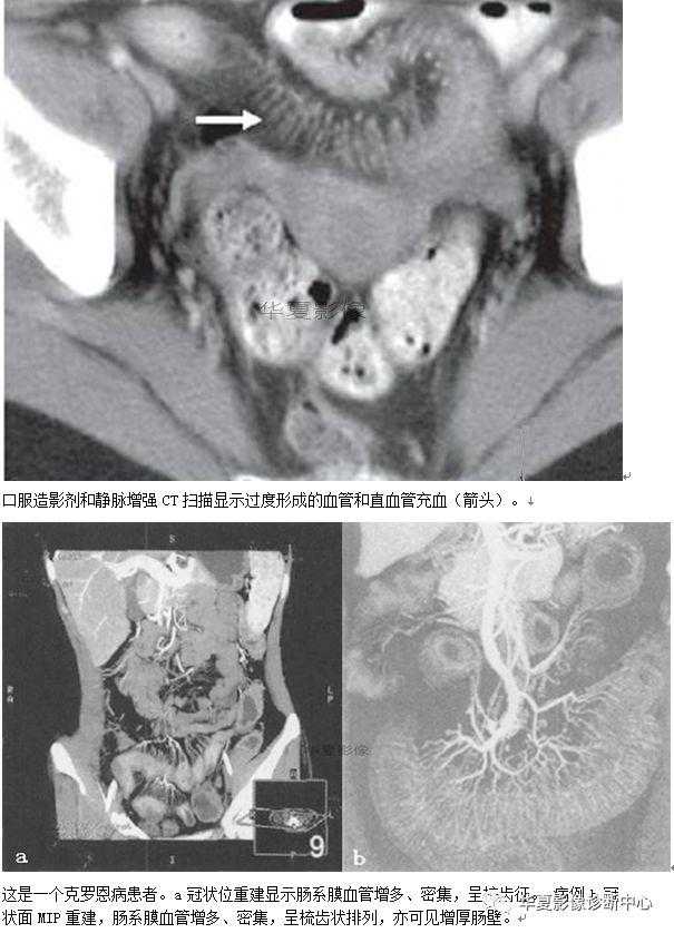 在已知患有克罗恩病的患者中,如果出现了上述的由肠系膜血管增生,扭曲、扩张,以及因直小血管的突出而形成的梳齿征时,表明疾病有急性恶化的趋势,有文献报道克罗恩病患者肠周血管显著提示疾病活动、进展或广泛蔓延。第一次出现临床症状的患者进行CT检查发现上述表现时,可以提出克罗恩病诊断的可能性,但并不是绝对特异性的征象,因为在狼疮性肠系膜血管炎中也可以出现类似的梳齿征。