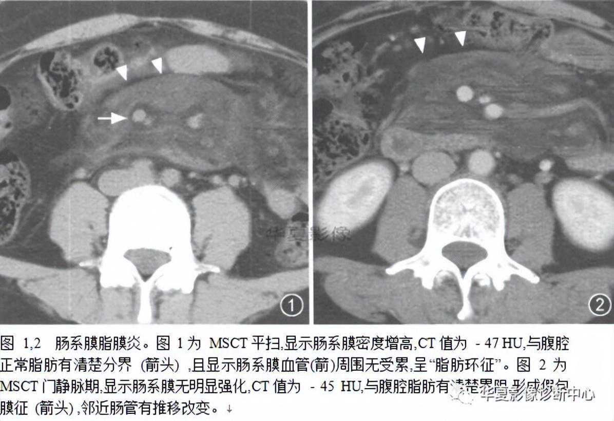 肠系膜脂膜炎以慢性毙比细胞浸润,脂肪坏死和纤维组织形成“假肿瘤结节”为特征,包绕但不侵犯肠系膜血管,肠系膜曲静脉血管位于病变内,邻近血管脂肪密度正常,形成脂肪环征。