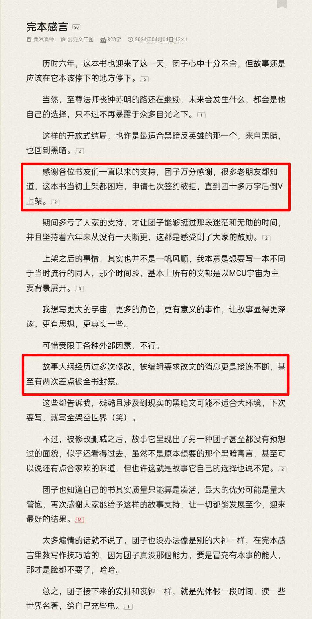 小说写了一年这样,有三百万字,篇幅还是不少的。不过这次完结也是被要求提前结束。