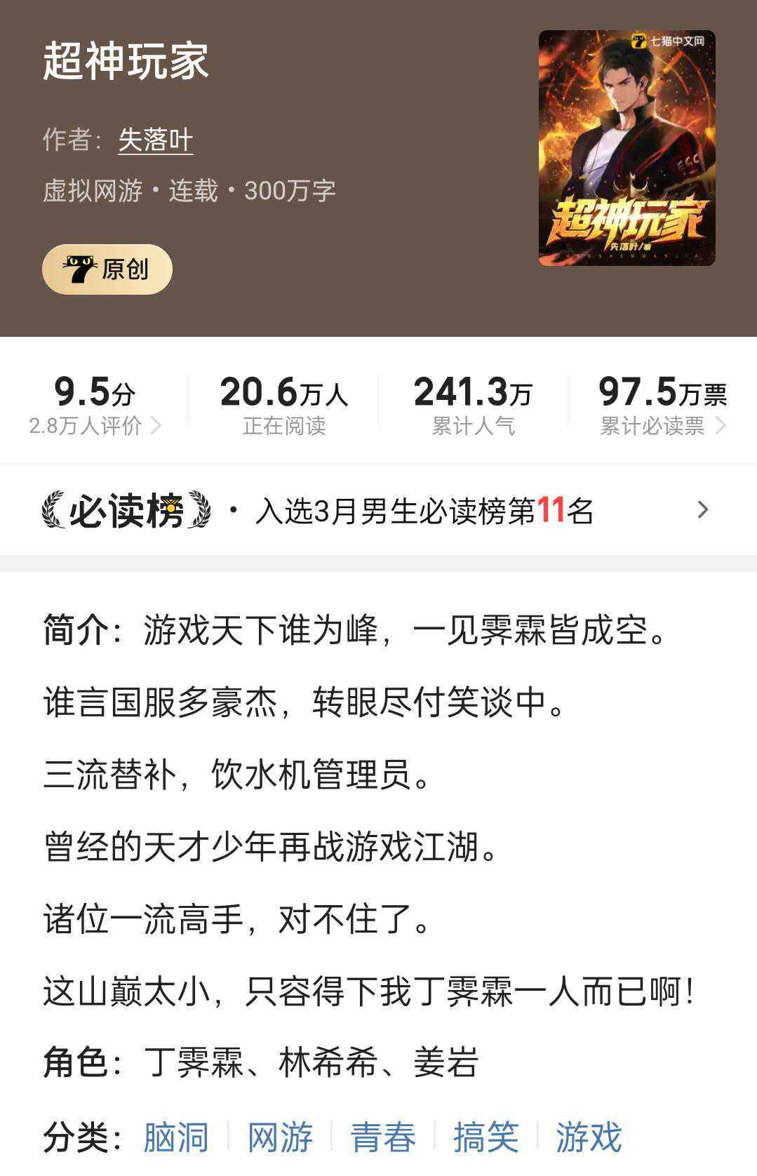 网游文大神失落叶在七猫首发的小说《超神玩家》也在今天完结了。