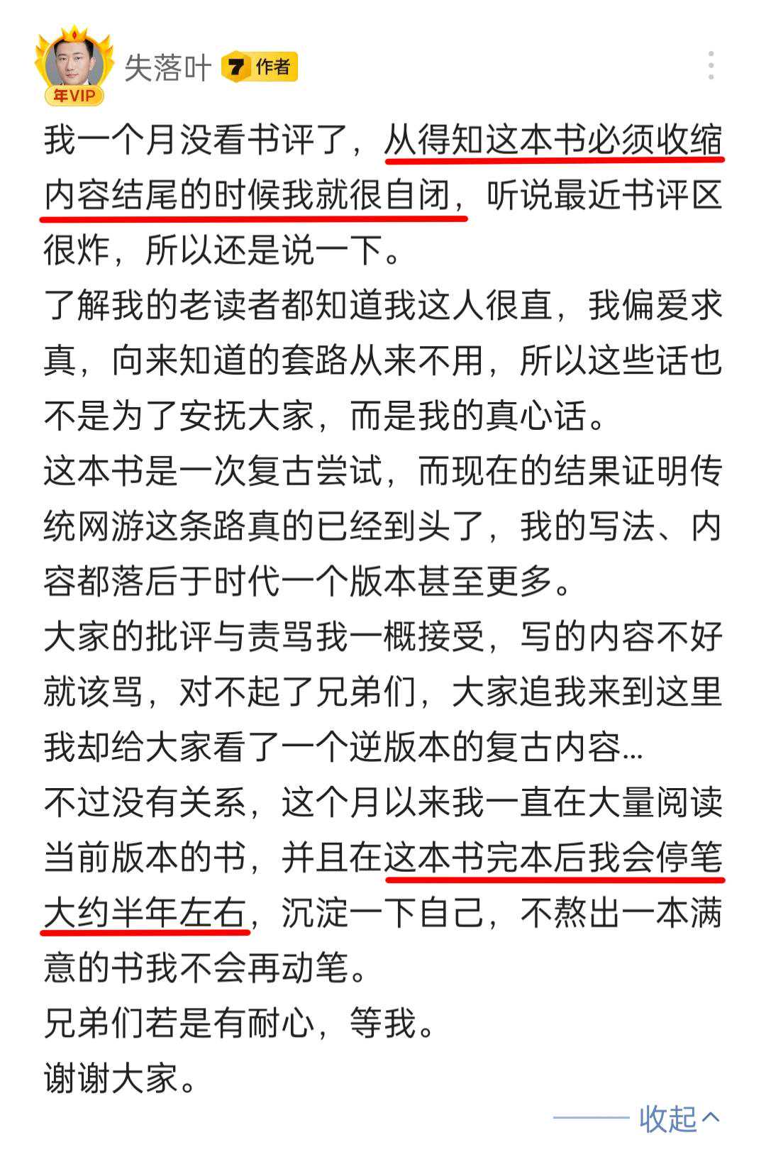 本身签的是七猫的买断合约,只是现在看来成绩上距离七猫的预期还是有差距的。失落叶也在之前有总结,更是打算沉淀半年,努力追赶当下的风口。
