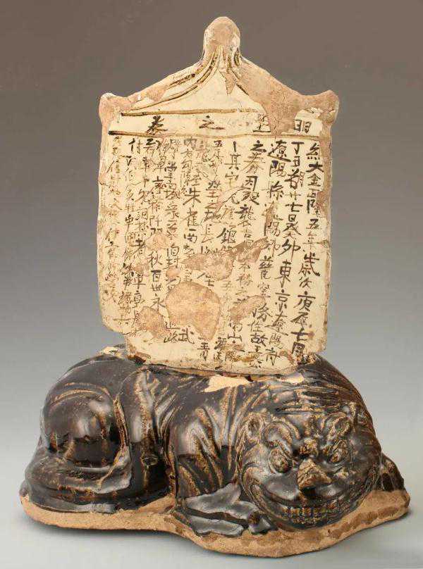 这件买地券下端两侧内截,插在酱釉瓷虎座上。据券文可知,券主王兴是“东京辽阳府辽阳县辽阳乡瓷窑务”,金正隆五年(1160年)去世。从神灵那里买来土地,用“青龙、白虎、朱雀、玄武”来说明土地的四至,确立墓主对土地的所有权,不受鬼神的侵犯。