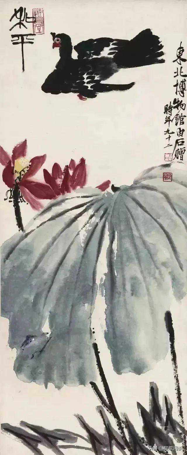 画家也是荷花池边常客,张大千抹黑荷叶,用叶的黑反衬花的粉、白、红,高洁、雅;谢稚柳的荷叶撑开一张巨伞,小鸟、蝴蝶、乃至知了在花叶、莲蓬之间嬉戏,是自然山水,也是人间仙境;陆抑的荷花三个字就可评价“禅意浓”;齐白石的荷花色彩具有与众不同的夸张与炫耀,大概也是荷尔蒙外溢的纸上证据,无论是水中的鸳鸯、游鱼,还是空中的老鸦、蝴蝶、蜻蜓都有着鲜明的形象特征,造型的个性化,是画家打上的深深烙印。