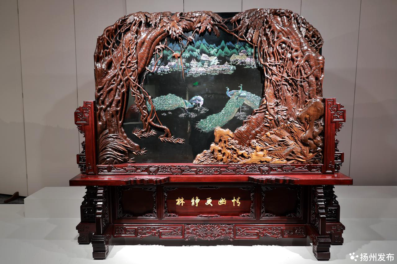 点螺楠木雕《峡趣》漆砂砚、雕漆嵌玉《名花竞艳》地屏、全骨镶嵌《板桥竹》地屏、点螺《运河明珠》大对瓶……珍宝馆三楼的“巧夺天工——扬州漆器髹饰技艺”展区,可谓珍品荟萃。