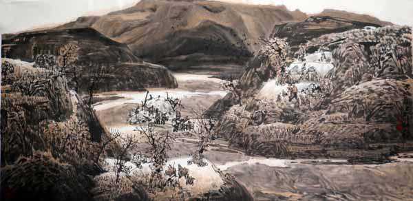 朝晖中的耕者、落日里的牧归,以及散布于塬野之间的小桥、流水、人家,草垛、窑洞、炊烟,无处不洋溢着最为真实的生活气息,以及黄土大地上生生不息的生命张力。而这种黄土大地特有的田园牧歌,让多少于城市喧嚣迷离的人们向往追寻,向往牧者吟唱的信天游,追寻落日里归家时内心的踏实。冬日里的雪野荒塬、大河两岸枝桠伸向天空的杂树,纵深的沟壑、迭起的山峁,雾雨风云、夕阳晨辉,展现了时序更替中黄土高原之上的自然律动之美。而这所反映的正是,中国山水绘画传承千百年来亘古不变的人与自然的相处之道。笔者也深深体会到,这种遨游于天地之间、畅达于自然之韵的精神状态,也正是国画山水蕴藏最为奥妙之处,是神游宇宙、万物同在审美哲学。