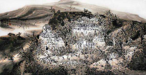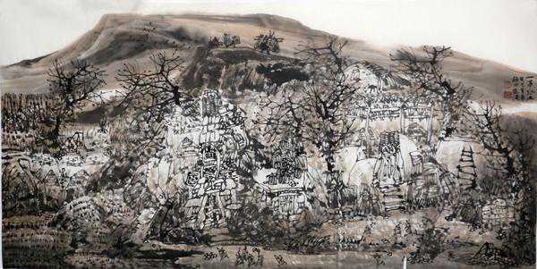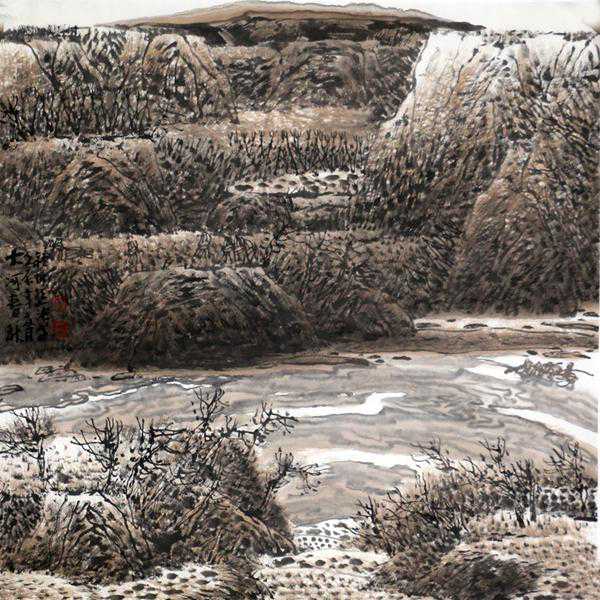 桂泱先生的黄土山水画作,立足于黄土大地“大”与“厚”的气象表达,以其充满自然灵性和传统神韵的线写笔墨样式,架构山水的视觉效果,营造其山水与传统有所区别的个性画面。同时又以其笔墨线性的独创性,黄土高原题材的符号性,带给读者时代山水绘画,贴近生活、接近地气之美的享受。在画面山水意像最妥帖、到位的塑写呈现和画家内心对自然山水最直观、真实的感受中,达到其情绪、精神、思想、审美,与黄土高原之上的山川、河流、草木以及生命心象的高度统一,也带领观者的灵魂走进黄土高原最纯净的精神沃土。