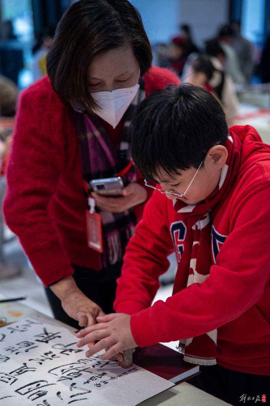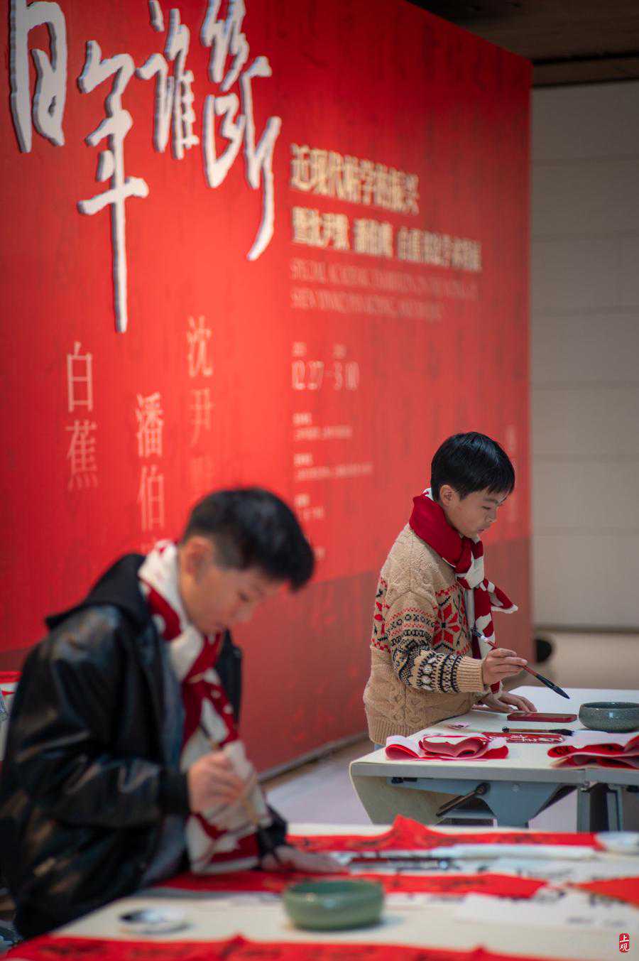 系上美术馆特意准备的红白配色围巾,格外喜庆。这批小书法家中年龄最小的只有8岁,但写起字儿来都有模有样。