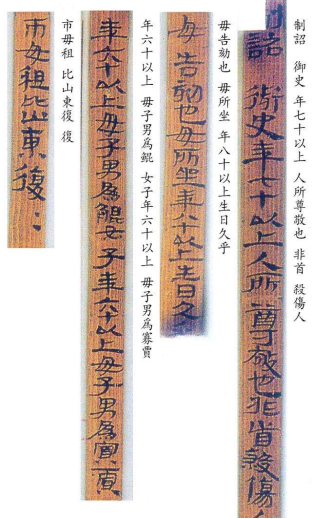 1959年到1983年期间,甘肃武威汉墓出土了一些鸠杖,还有皇帝颁布的诏书(木简)——《王杖诏书令册》与《王杖十简》,2000多年前的养老法律呈现在我们面前。