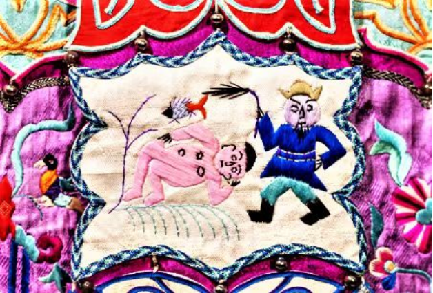 “卧冰解衣不惧寒,冰化鱼跃供母前。求鲤成双德报怨,鲤载孝圣遨世间。”王祥是用宽容与孝心感动了天地,融化了坚冰。他的故事,被世人久久传颂,有人将此故事制成图案,秀于服饰之上。这款云肩,即是通过卧冰求鲤的故事,将“百善孝为先”与“以德报怨”的价值观念用刺绣的方式表达出来。